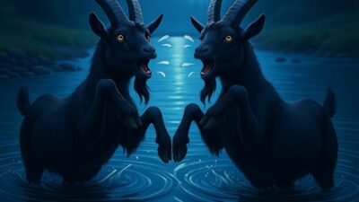 Sekitar lima meter di depan, di tengah aliran sungai, terlihat dua ekor kambing berbulu hitam. Yang satu lebih besar, seolah jantan, dan yang satunya lebih kecil, seperti betina. Anehnya, keduanya berdiri menantang arus, lalu serentak mengangkat dua kaki depan mereka. Suara “mbeeek!” melengking, memecah sunyi malam.