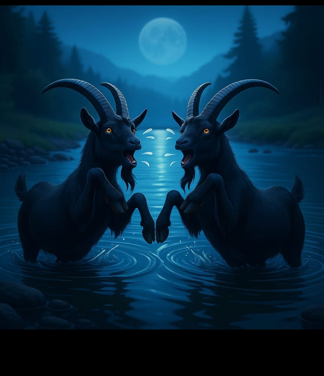 Sekitar lima meter di depan, di tengah aliran sungai, terlihat dua ekor kambing berbulu hitam. Yang satu lebih besar, seolah jantan, dan yang satunya lebih kecil, seperti betina. Anehnya, keduanya berdiri menantang arus, lalu serentak mengangkat dua kaki depan mereka. Suara “mbeeek!” melengking, memecah sunyi malam.